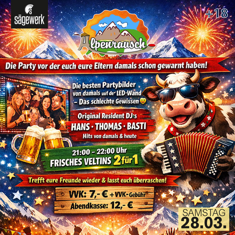 Die Party, vor der euch eure Eltern damals schon gewarnt haben! Für eine Nacht holen wir den legendären Alpenrausch zurück - laut, wild und voller Erinnerungen. Wir lassen noch einmal die Kuh fliegen und feiern so wie früher... vielleicht ein kleines bisschen besser...